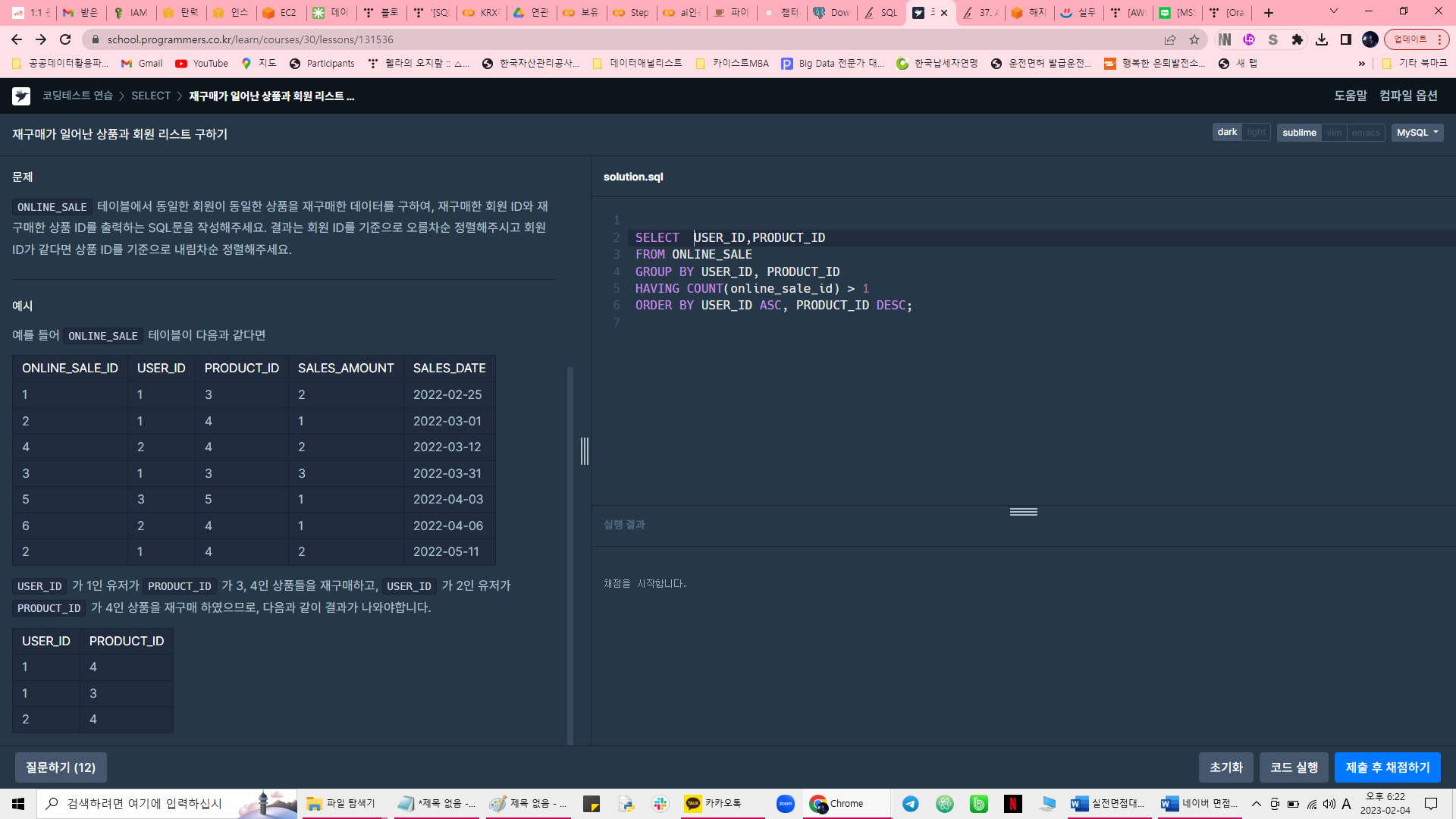 --> 답안의 문제점!!! having 조건을 활용해서 중복인 행만 출력했어야한다!! 이렇게 하면 재구매 안한 회원도 출력되는 효과