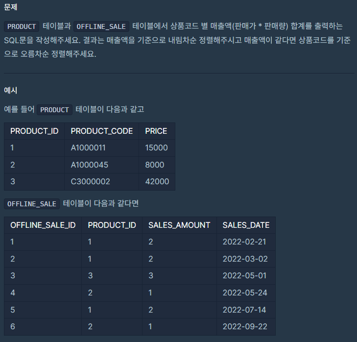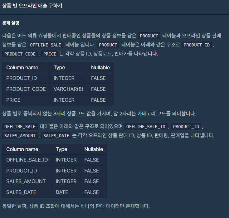 처음 이문제를 보았을때 product 테이블과 offline_sales 테이블 의 key 값이 product_id로만 조인할수 있게 되어있다.