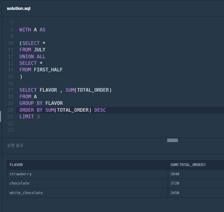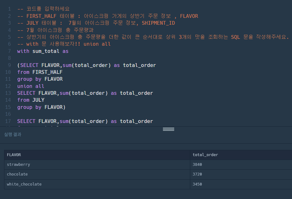 마지막 select에서 flavor 맛만 한컬럼만 추출해야하는데!!!!! sum값까지 추출해서였군!!이런 단순실수를 절대 nono!!!